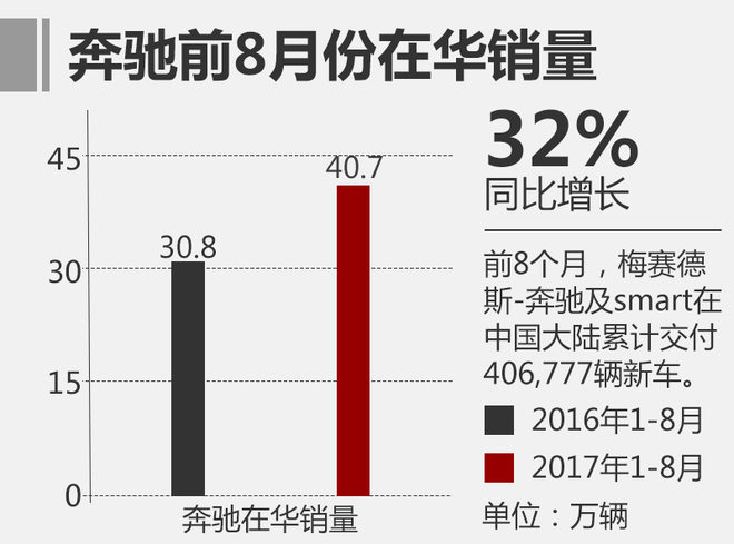 截止到今年8月份,梅赛德斯-奔驰已连续56个月实现在华正增长,并保持着持续稳定的发展态势。前8个月,梅赛德斯-奔驰及smart在中国大陆共累计交付406,777辆新车,相比去年同期增幅达到32%。其中国产车型的销量不断攀升,同比增长接近40%,在总销量中的占比也达到了70%以上。