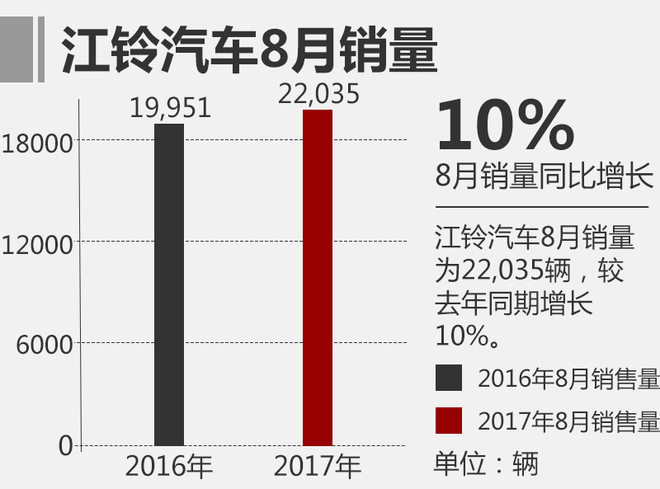 福特汽车在华另一家合资公司——江铃汽车8月份单月销售超2万辆,较去年8月份增长10%;今年1至8月份累计销量超18.5万辆,较去年同期增长16%。其中,福特途睿欧 (配置|询价)及江铃皮卡双双取得佳绩,涨幅较去年8月份同比分别高达140%和15%。