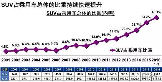 在中国,SUV比重也在进一步提升。中汽协数据显示,SUV比重从2011年的11%增长到2017年上半年40%的水平,其中自主品牌SUV 1-7月累计销量为308.7万辆,占自主品牌总销量的53.3%,迄今仍以高于市场增长率的速度增长。