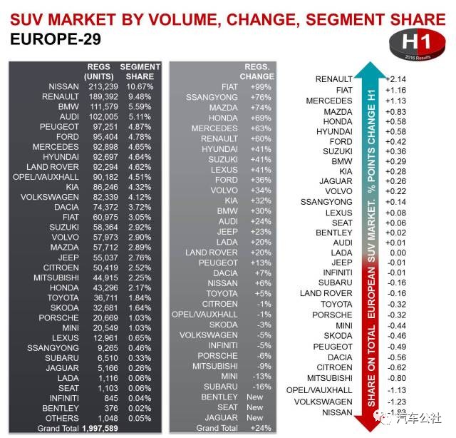 日产的合作伙伴雷诺在欧洲的SUV细分市场表现第二好。由于卡缤和科雷嘉的强势表现,雷诺SUV的注册量同比增长了60%。宝马、奥迪、福特、现代、起亚和菲亚特都实现了不低的SUV增幅。而大众虽然只有一款途观打天下,但未来SUV军团可让人不敢小觑。