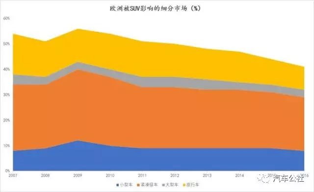 IHS并未在欧洲发布类似的消费习惯报告,但是SUV的确阻碍了小货车、紧凑型轿车等细分市场的发展。JATO的数据显示,minivan的市场占比已经从巅峰时期2007年的16%下滑到2016年9%。紧凑型轿车的份额从26%下跌至2016年的21%。中型车也从当年的13%下滑到如今的9%;甚至在欧洲称雄称霸的小型车市场也受到了SUV的冲击。