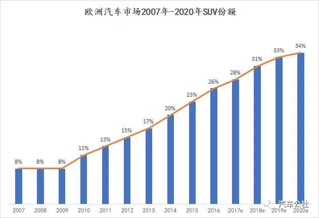汽车行业信息咨询机构JATO的数据显示,从2007年到2016年,欧洲市场的SUV占比从8%增长到26%,且继续进一步增长。汽车研究机构LMC Automotive预测,2017年,欧洲市场SUV销量将达400万辆,市场份额增长至28%;到2020年,欧洲SUV销量将达570万辆,市场份额为34%。