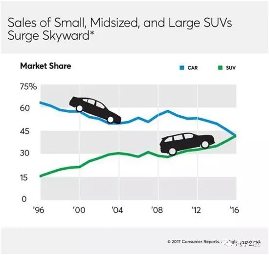 SUV在欧洲车市份额的一路飙升与全球趋势相一致。在美国,据《汽车新闻》数据中心数据显示,从2000年,到2007年,再到2016年,CUV(crossover utility vehicle)的市场份额从6.1%增长到16.8%,再到33.8%。如果把皮卡、SUV、CUV等都包含在内,2016年该类轻型车销量高达1060万辆,占比60.7%。
