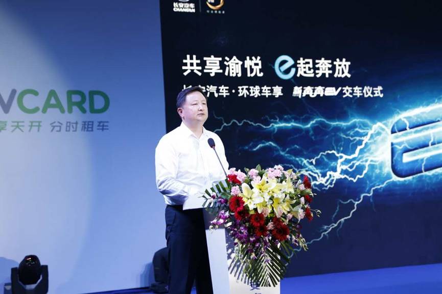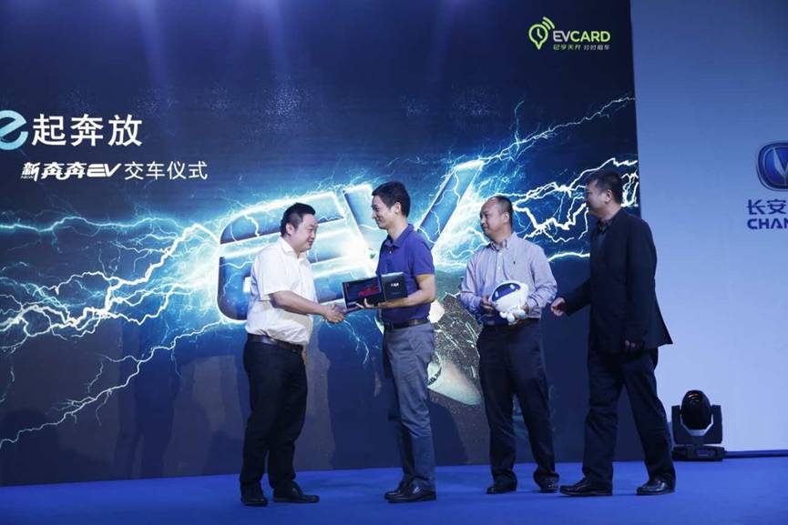 重庆市经济和信息化委员会汽车工业处副处长王含、环球车享汽车租赁有限公司副总经理徐江、长安汽车股份有限公司副总裁龚兵、重庆长安汽车股份有限公司总裁助理叶沛、万友汽车投资有限公司总经理、党委副书记蒲星川共同按下发车启动装置,象征着环球车享这500台长安新奔奔EV正式进入重庆分时租赁市场。