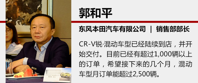 此外,在混动车型方面,东风本田汽车有限公司销售部部长郭和平表示:“CR-V锐·混动车型已经陆续到店,并开始交付。目前已经有超过1,000辆以上的订单,希望接下来的几个月,混动车型月订单能超过2,500辆。”