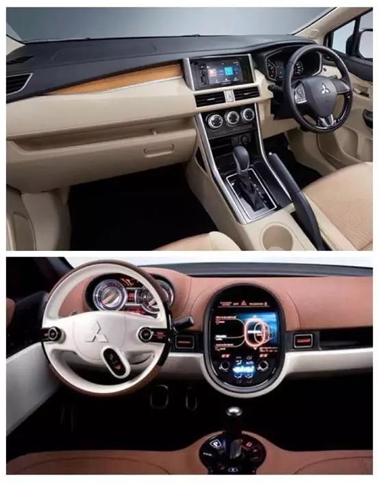 又或者是三菱Expander的内饰设计,中控台造型简洁且控制区较为规整,其整体采用黑色与米色搭配,并以木纹饰板进行装点,简洁大方,线条清晰有力,与挂在方向盘上的"三段菱"车标十分相称。作为对比,我们可以看看三菱Concept CX概念车,大量的圆形元素以及柔和线条,放眼看去,立体感十足的"三段菱"反而与内饰不搭了。总之,内饰设计也会采用车标的设计元素,但更多是从整体轮廓出发,希望与外形上能有所呼应,但是内饰设计不同于外形设计,需要考虑人机工程、材料使用、拼接工艺、贴合大众审美等因素,而且同一品牌需要建立起不同的设计语言和价格区间,所以很难有很好的设计延续性。
