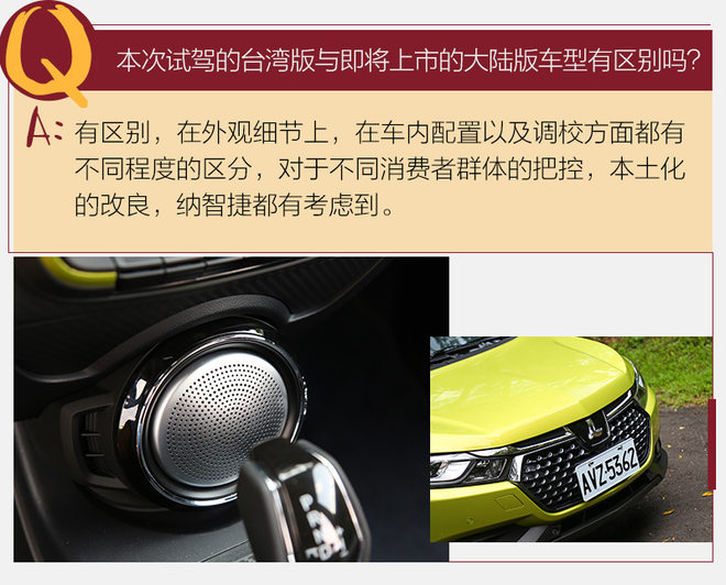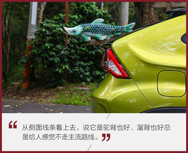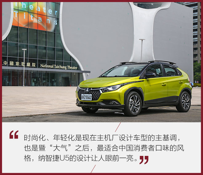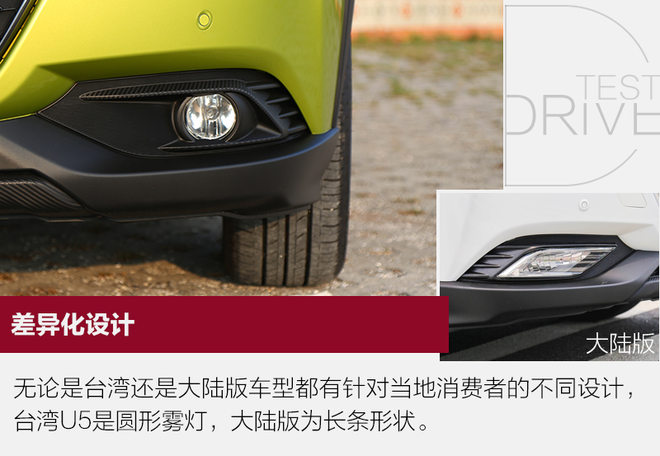 本次试驾的车型为台湾版U5,与大陆销售版本细节上有所出入,雾灯的样式将由圆形转为长条状,格栅大陆版将增加镀铬装饰,这种设计迎合了时下汽车设计的潮流。前大灯组造型取意在女生化妆的眼线,一直延伸至A柱位置,很形象。前大灯光源为卤素,同级别车型也大多如此。