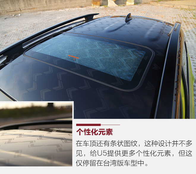 在车身各处还有不少仿碳纤维的材质,如果不仔细看的话,并不容易被发现,这也是年轻人喜好的元素。车尾的设计最特别,从侧面看好似有点驼背,车尾层次分明,很有立体感。尾灯位置较高,将视觉重心上移,给人直观的感受就是U5变得更高了。
