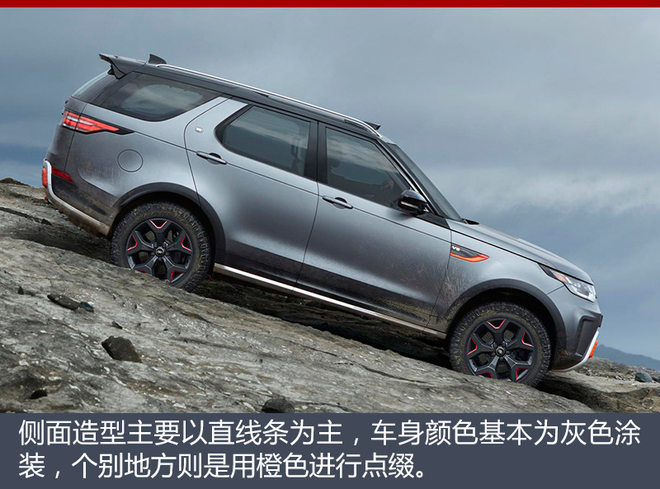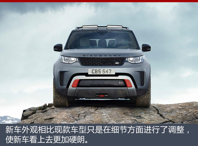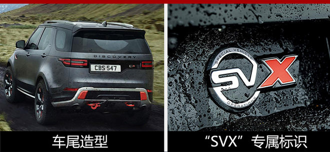 外观方面,路虎全新发现SVX车型虽然基本延续了现款车型的造型,但还是在细节方面展现了这款车的特别之处。车身看上去更加硬朗,前脸造型也采用了路虎家族最新的设计风格,进气格栅以及翼子板上的通风孔也是独有的设计,前后保险杠都与标准版车型有所不同,两侧的进气口也更加立体,肌肉感十足。