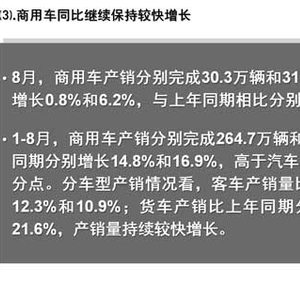 1-8月,汽车产销1767.83万辆和1751.11万辆,同比增长4.67%和4.25%,增速继续保持在4%-5%的区间。商用车产销264.74万辆和270.37万辆,同比增长14.84%和16.91%。商用车保持15%-17%左右,维持了快速增长势头。货车产销234.86万辆和240.46万辆,同比增长19.55%和21.62%。在货车主要品种中,重型货车产销75.62万辆和76.82万辆,同比增长74.48%和74.85%。中型货车产销15.62万辆和15.41万辆,同比增长12.44%和11.03%;轻型货车产销107.88万辆和108.71万辆,同比增长9.39%和9.46%;微型货车产销35.75万辆和39.52万辆,同比下降11.98%和2.63%。