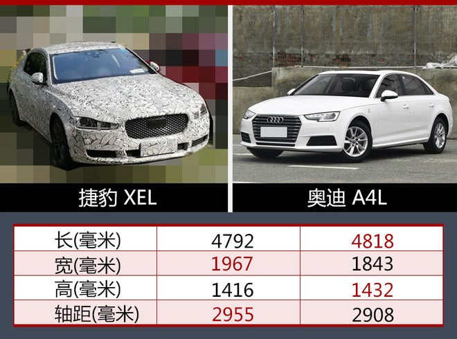 根据数据显示,捷豹XEL长宽高分别为4792*1967*1416毫米,轴距达到2955毫米;与同级别车型奥迪A4L相比,新车除了长度、高度方面低于后者,宽度和轴距均占有优势。