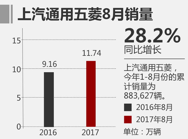 今年8月份,上汽通用五菱销量达117,422辆,较去年同期的91,604辆,同比增长了28.2%;上汽通用五菱1-8月份累计销量883,627辆,较去年同期的804,961辆,同比增长了9.8%。