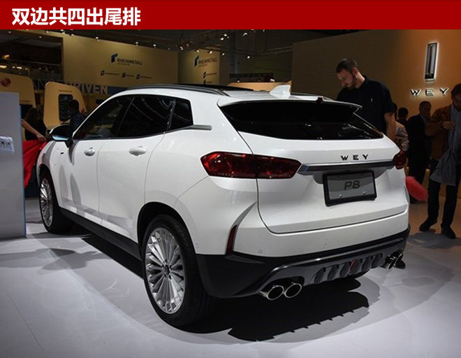 P8是WEY品牌旗下首款插电混动SUV,该车已于本届法兰克福车展中正式发布。网通社从WEY经销商了解到,WEY P8有望四季度正式上市。外观方面,新车前脸采用大嘴式进气格栅设计,配以两侧狭长型头灯组,整体突显精致感。动力方面,P8搭载由2.0T涡轮增压发动机+两个电动机组成的插电式混合动力系统,百公里油耗仅2.3升。