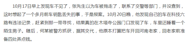 丢失车钥匙后,车主并没有及时报警和更换车钥匙,最后车子成为了小偷的囊中之物,幸好这个小偷最后也没逃过交警的法眼,车主也非常机智地“夺回”爱车。