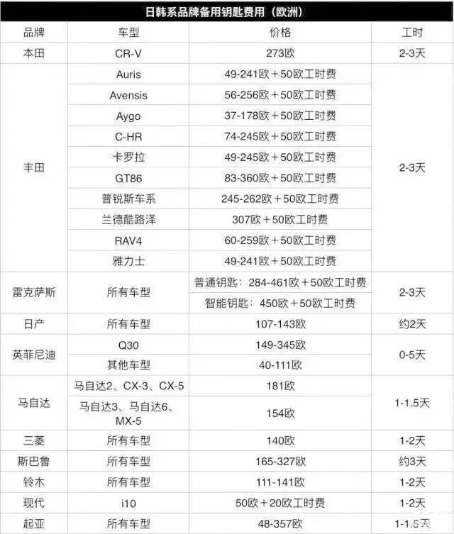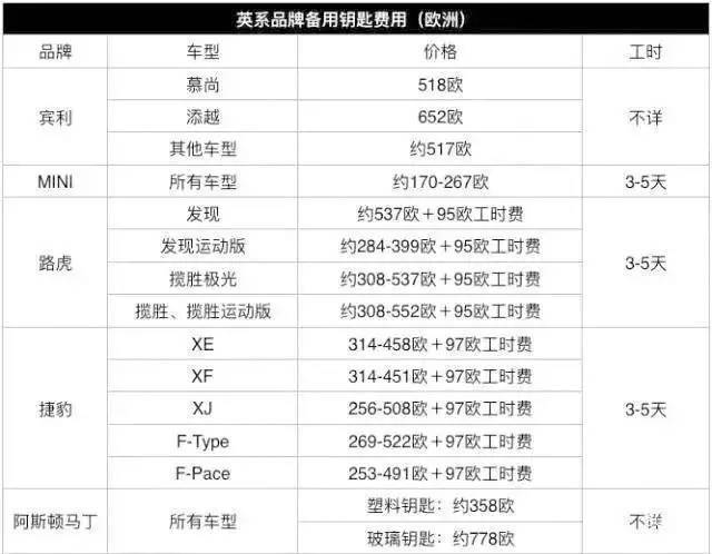 我们先来看一组配钥匙的官方价格表,在欧洲配一把车钥匙的价格: