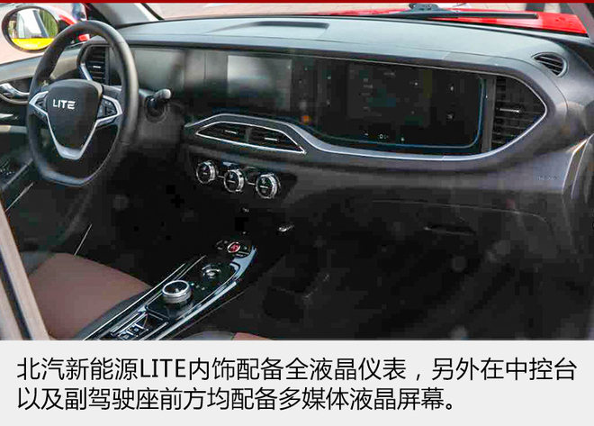 内饰方面,北汽新能源LITE配备全液晶仪表,另外在中控台以及副驾驶座前方均配备多媒体液晶屏幕。同时作为智能电动车,LITE还以可用手机App远程查看整车状态,在功能上还配备了“半自动泊车”、“车道偏离预警”等配置,并支持百度CarLife手机互联及智能语音识别,让驾驶更为轻松。