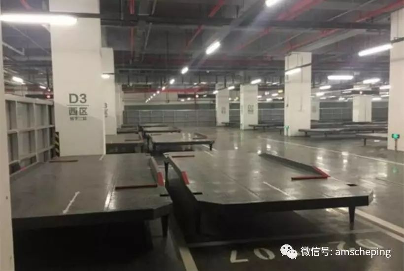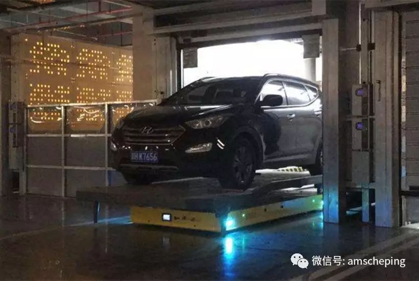 AGV泊车机器人系统,只要把车开进一个特殊的独立车库,将车辆平稳地开到中间车架上后,司机按提示锁车离开,随后会有带着轮子的智能传送托盘将车架整体搬运至后方车库,机器人系统可以完成路径导航、定位停放,误差在两毫米内。