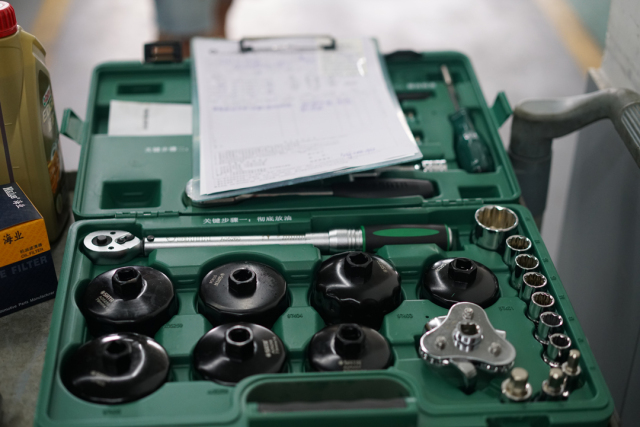 检查车况OK后,技师便更换机油机滤。看着专业的更换机滤工具,教授更放心了,毕竟能如此规整的摆放工具,部分4S店可要学习一下了。