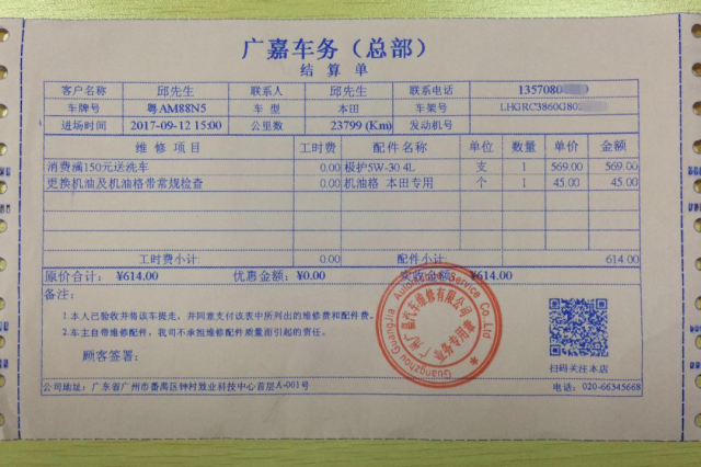 车辆在清理内饰时,教授回到休息区。服务顾问已将保养费用单算好,教授发现在嘉实多护车保养站做小保养,只需要购买机油及机油滤芯,消费满150元即免收工时费!粗略计算与4S店保养差价不大,而且能用上嘉实多极护全合成机油,以及享受专业保养团队服务,教授认为这钱花的值!