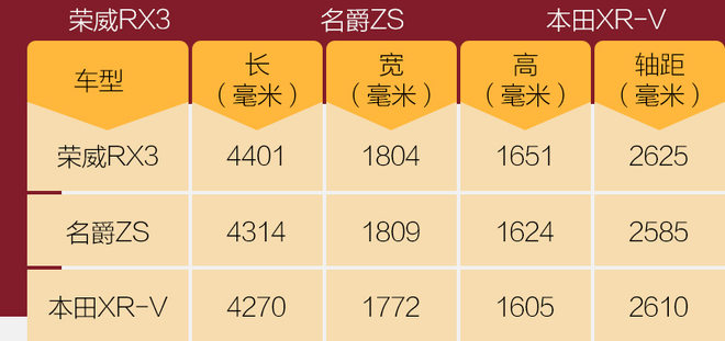 荣威RX3的车身尺寸相比起名爵ZS或本田XR-V (配置|询价)等小型SUV来说,有着明显的优势,但和”大哥“RX5相比,它又显得有些偏小,它显然是一款专注细分市场的跨级别车型。