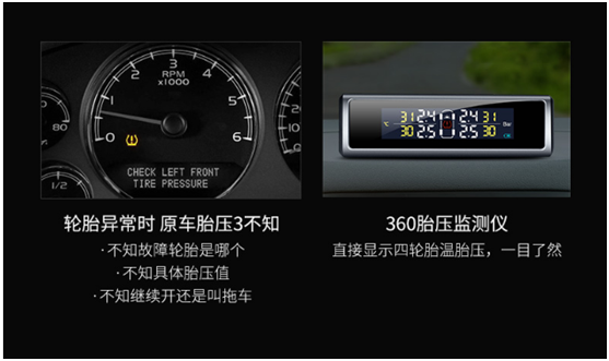 图2:360胎压检测器内置版与车辆自带胎压监测系统对比
