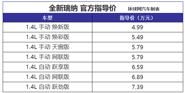 动力方面,全新瑞纳将搭载一款1.4L自然吸气发动机,最大功率为70千瓦,峰值扭矩为132牛·米,传动系统匹配了一款5速手动变速箱和一款4速自动变速箱。