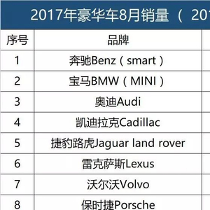2017年8月12个豪华车品牌官方公布的销量为220,205辆,同比增长21.1%,环比增长7.41%;1-8月豪华车市场累计销量为1,632,634辆,同比增长18.9%。按照目前发展的态势,预计今年豪华车市场整体会保持近20%的增长,销量预计在240万辆左右。