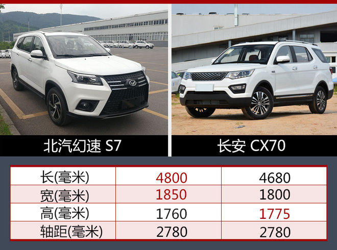 根据数据显示,北汽幻速S7长宽高分别达到4800*1850*1760毫米,轴距达到2780毫米;相比同级别车型长安CX70,新车与后者轴距相同,但在长度和宽度方面占有优势。