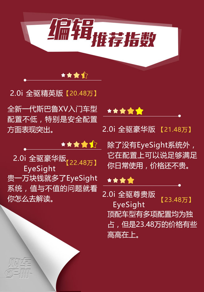 总结:虽然全新斯巴鲁XV只提供了四款车型可供选择,但是三万元的最大价差、EyeSight、LED大灯等等这些因素也够消费者犹豫一阵子,说白了还是钱的问题,三万元说多不多、说少也不少,如何取舍还得具体问题具体分析。(图/文 网通社 刘可)