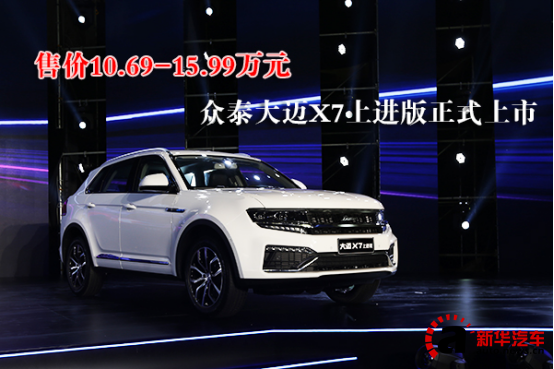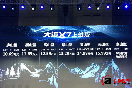 新华网北京9月21日电 9月20日,众泰大迈X7上进版正式上市,售价区间10.69-15.99万元。新车采用庐山型、衡山型、嵩山型、华山型、黄山型、天山型等命名。另外,大迈X7上劲版泰山型将于今年10月份发布。