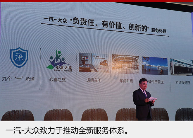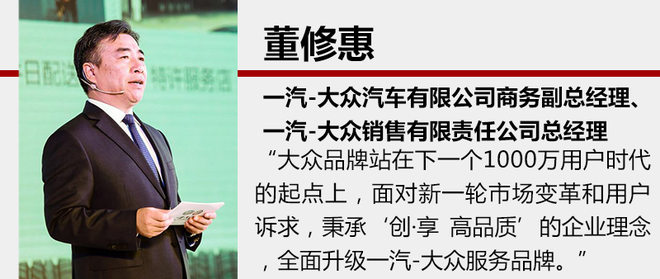 董修惠还说到:“改革开放以来,中国汽车市场经历了三个发展时期。而一汽-大众服务品牌创建11年以来,我们在售后服务领域一直引领行业的潮流,且不断致力于服务品质、服务效率和服务体系的提升。从‘九个一承诺’到‘心喜之旅’,从‘透明车间’到‘车间升级’,再到‘备件日配送’、‘特许服务店’,我们建立起了‘负责任、有价值、创新的’服务体系,在整个行业里堪称标杆,有效推动了汽车服务业的发展,赢得了近千万用户的信赖。”
