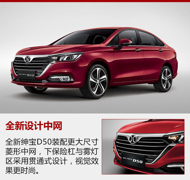 全新绅宝D50长宽高分别为4630*1820*1480毫米,轴距为2670毫米。相较现款,长宽分别增加48/26毫米,高度减小6毫米,轴距增加20毫米。新车进气格栅为全新样式,采用菱形边框穿插多横幅设计;下格栅应用时下流行的贯通式结构,并对雾灯区进行了扁平化处理,视觉效果更锐利,符合当下审美潮流。