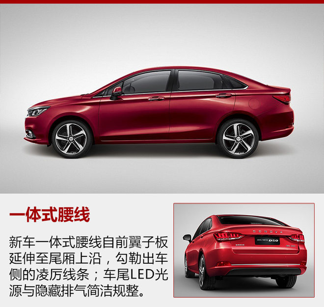 车侧上腰线由现款分段式改为全新车型上的一体式,且由前翼子板直接延伸至尾厢上沿,呈环绕状,突出整体性。车辆尾灯加入LED光源,保险杠黑色包围上方增镀铬饰条,两侧发光条面积略微增大。同现款一样,全新绅宝D50采用隐藏式尾排设计,规整简洁。