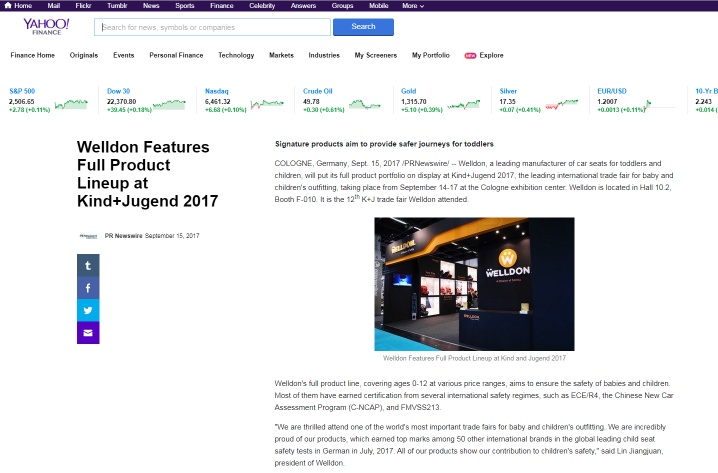9月15日,《雅虎财经》发布了一则题为《Welldon Features Full Product Lineup at Kind+Jugend 2017》的报道: