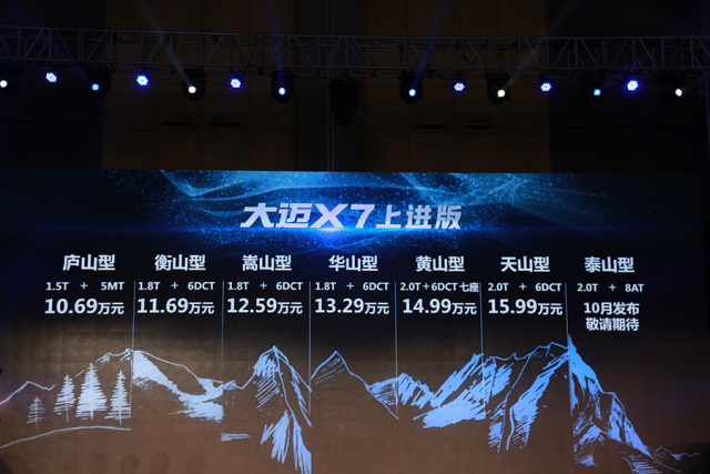 大迈这名字本身起的够有气势,具体车款的名字也很搭,一种致敬名山大川的霸气。它不但是名字搞得气吞山河,下面的这个口号也是令人咂舌,这标语连专注做SUV的长城哈弗品牌也没这么说啊。