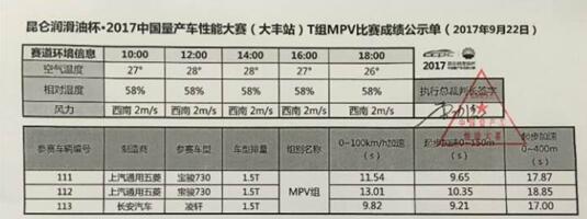 而首个比赛日的结果也不负众望,在MPV组的直线加速测试项目中,长安凌轩1.5T车型以0-100km/h加速9.82s,起步0-150m用时9.21s,和起步0-400m用时17s的成绩夺冠,而同组别的竞争对手宝骏730 1.5T车型上述三项分别获得了最快11.54s、9.65s及17.87s的成绩,再次被碾压。