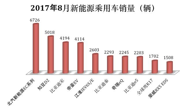 具体到车型(不分纯电动和插电式混合动力),前三甲依然没有变化,还是铁打的北汽新能源EC系列、知豆D2和比亚迪宋。不过比亚迪宋在7月还是销量冠军,8月就落到了第三名。