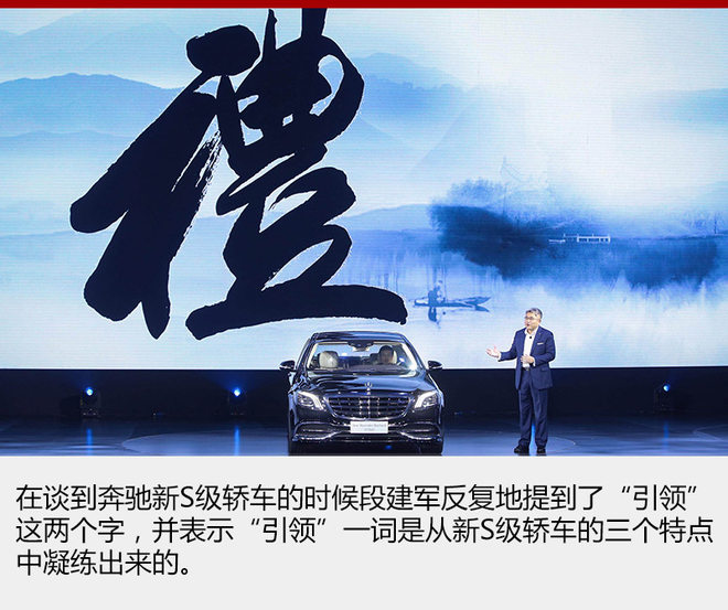 在谈到奔驰新S级轿车的时候段建军反复地提到了“引领”这两个字,并表示“引领”一词是从新S级轿车的三个特点中凝练出来的,他说:“这款新车的特点从三个方面来讲就是:引领设计之尊、引领豪华之巅、引领智能之先。”