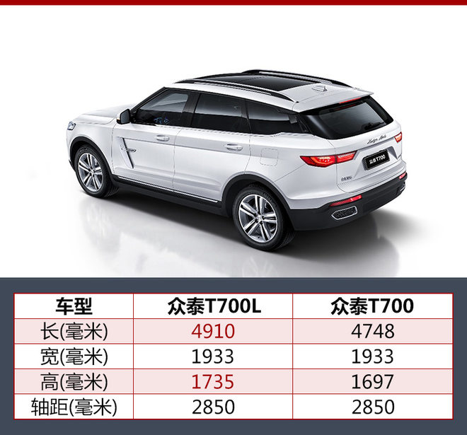 从T700开始,众泰的车型逐步摆脱了模仿的痕迹,拥有了自己的家族式语言。按照规划企业还将推出7座车型T700L进一步填补其市场空白。网通社从众泰汽车获得了T700L车型的官图,新车外观大体与现款T700保持一致,但车身长度和高度有所增加,同时内部将采用2+3+2的7座布局。另据了解,这款车有望在今年年内正式上市。