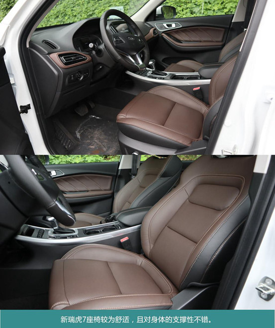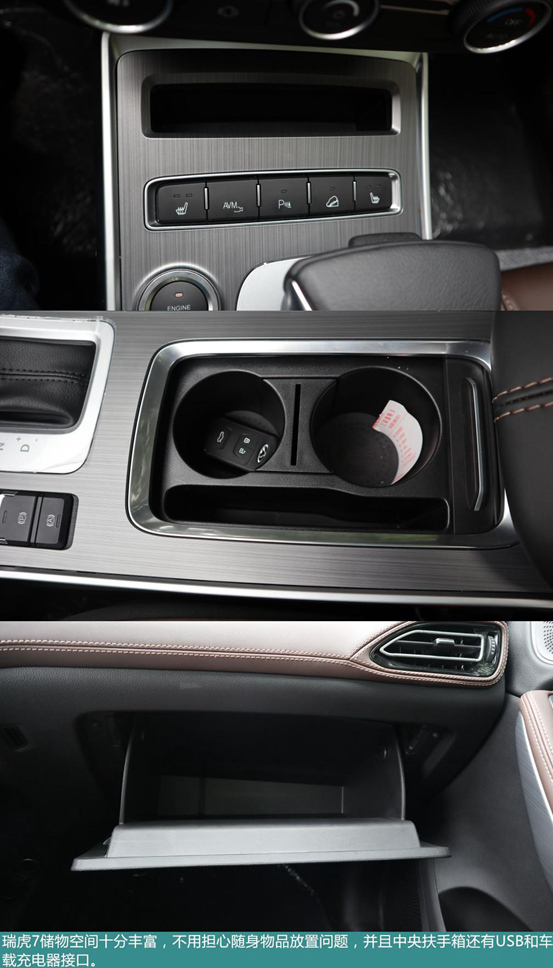 新款瑞虎7的内饰造型并未发生改变,但这并不是重点。新车内饰给我的第一印象就是舍得用料,不管是中控台还是车门面板,均采用搪塑或者皮革软质材料进行包裹,且做工精细。而且,物理按键良好的阻尼感以及多媒体插口防尘罩的使用,在细节方面也十分用心。除此以外,新车在配置上也进行了升级,与现款同车款相比,增加了电子手刹、自动驻车、陡坡缓降、HMI3.0智能交互系统等功能。