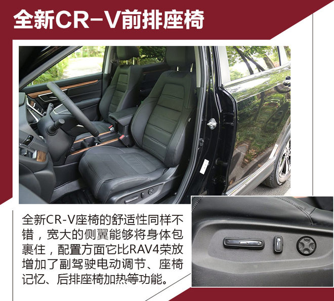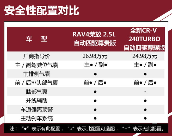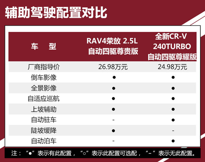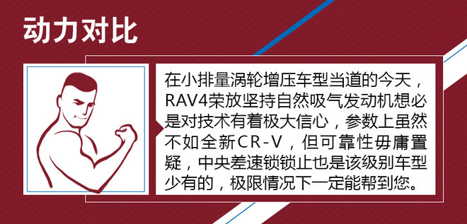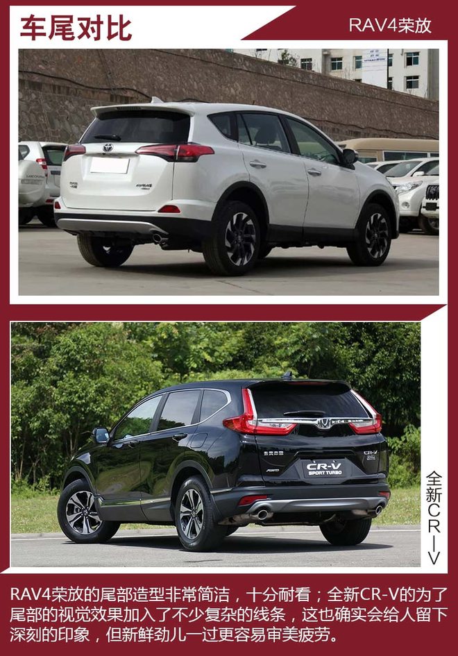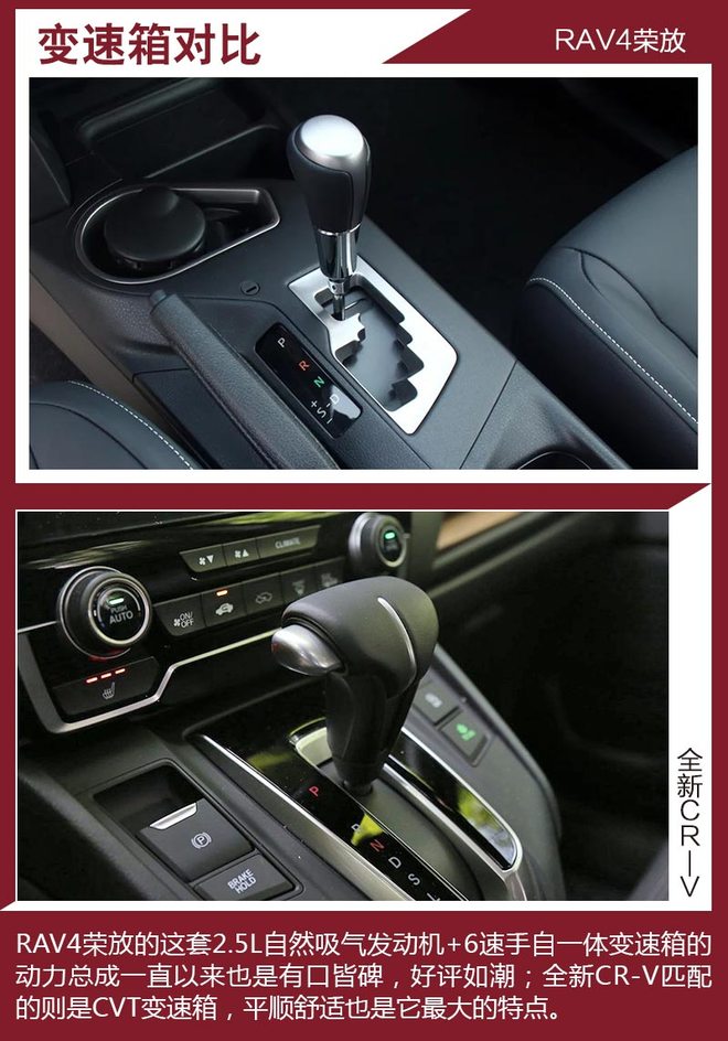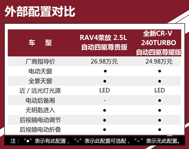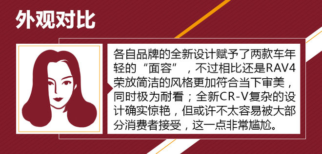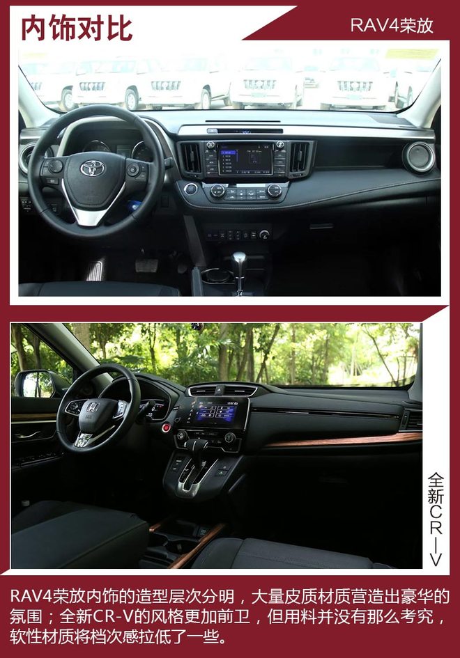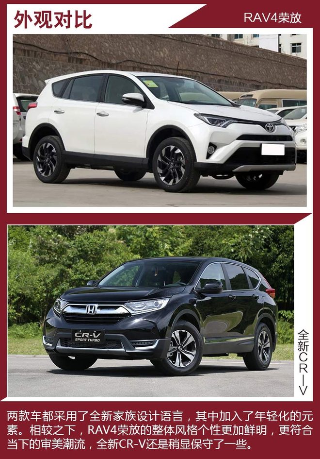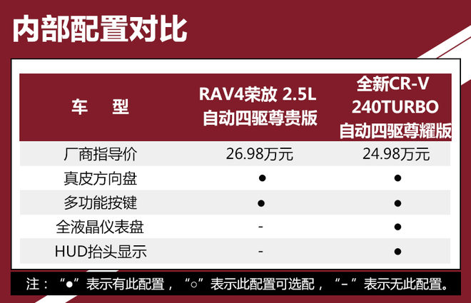 对比车型上,我们选取了拥有相对丰富配置,能够体现各自优势的车型进行对比,分别是一汽丰田RAV4荣放 2.5L 自动四驱精英版。本田全新CR-V 240TURBO 自动四驱尊耀版。