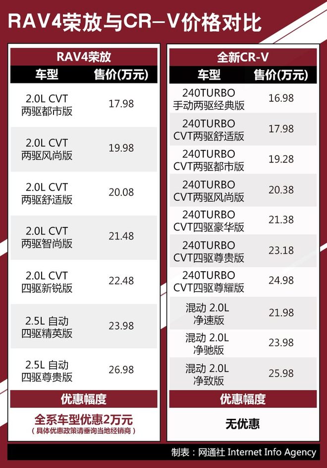 RAV4荣放早在2016年7月就先行发布了改款车型,全系7款车型覆盖了17.98-26.98万元的售价区间;全新CR-V则是今年8月才刚刚上市,10款车型提供了两种不同的动力系统,售价为16.98-25.98万元。虽然从售价和新鲜程度上来看,后者似乎都更有优势,但是目前RAV4荣放全系车型都可以享受两万元左右的优惠,而“新鲜出炉”的全新CR-V不仅没有任何优惠政策,而且部分地区还存在加价提车的情况,因此从售价层面来说还是前者更为亲民。