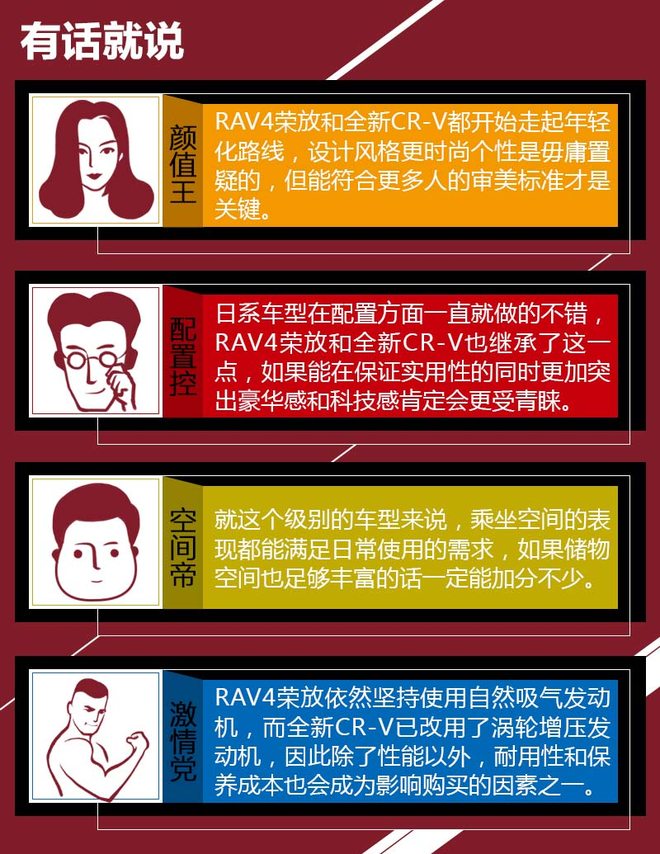 两款车本就是紧凑型SUV中的佼佼者,也都拥有着不俗的实力,而在换代之后它们的实力也提升到了一个新的台阶,RAV4荣放简约的设计风格更符合大多数人的审美标准,众多实用性配置以及丰田家族出色的四驱系统也让它更加“务实”;全新CR-V虽然将“新”的优势发挥了出来,但是从目前来说,加价提车的情况让它的性价比下降了不少,所以对于那些持币购车的消费者来说RAV4荣放才是眼下更为理性的选择。