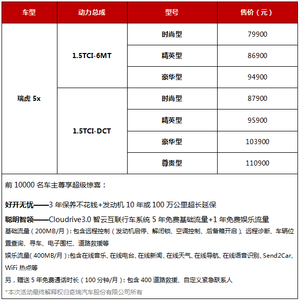 凭借融合捷豹路虎、观致技术的T1X专业平台,加持全新智云互联行车系统Cloudrive3.0,瑞虎5x的“好开”和“聪明”两大基因不仅赢得了国际舞台的检验与认可,更成为瑞虎5x最亮眼的标签。设计理念、动力总成、智能科技全面引领突破的瑞虎5x,无疑将增强瑞虎家族的竞争实力,“好开又聪明”的瑞虎5x也定将为消费者带来品位、智慧、充满乐趣的出行体验!