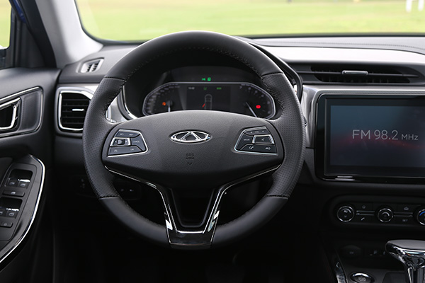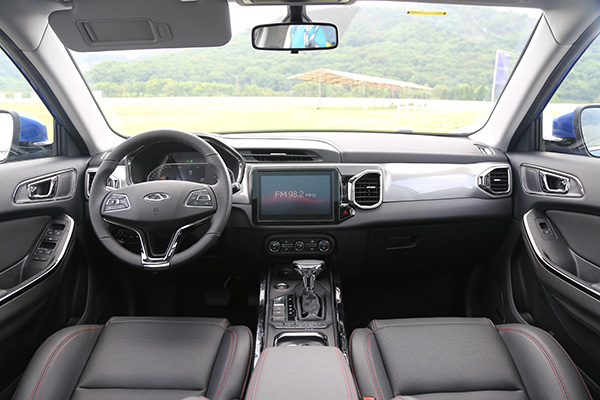 瑞虎5x的内饰采用不对称设计风格,并由大面积软质材料和皮质包裹,搭配红色缝线,多了几分运动气息。