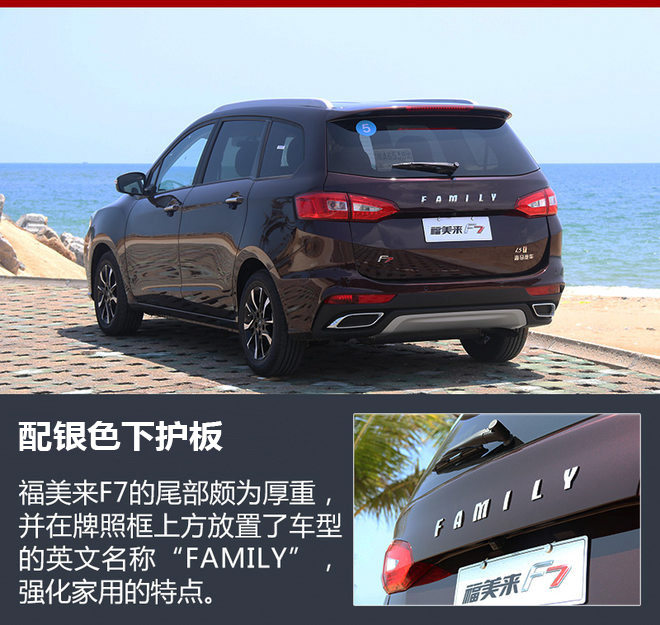 福美来F7的整体流线较为简洁平整,尾部显得十分厚重,并在牌照框上方放置了车型的英文名称“FAMILY”。新车的长宽高分别为4,770*1,800*1,695毫米,轴距为2,800毫米,内部采用7座布局设计。