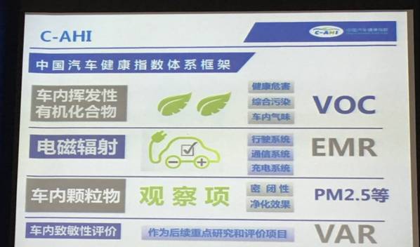 为了使车内环境更加健康,近年来国内多家检测机构、研究单位也在尝试做出努力,其中在国际交通医学会(ITMA)指导下,由中国汽车工程研究院股份有限公司(简称中国汽研)发起并主导,在对汽车工业强国的消费市场和技术发展研究的基础上,经过大量的理论研究和试验摸底,9月20日在中国汽研学术会议厅,“中国汽车健康指数(C-AHI)”测试评价体系框架正式发布。该指数以服务社会为根本,以提升车内环境健康为目的,充分发挥跨行业合作的叠加优势,更好地引领理性购车消费潮流,推动行业健康发展。