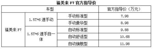 中新网9月29日电 日前,一汽海马首款七座多功能家轿”――福美来F7正式上市。本次上市的福美来F7共推出五款车型,官方指导价为7.98万-11.98万元。凭借着“非面包车血统、轿车级安全舒适”的产品核心优势,以及极具竞争力的价格,福美来F7将成为10万元级别自动挡七座家轿市场的标杆车型。