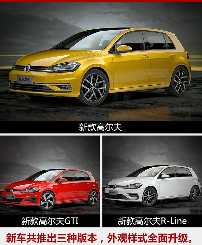 新款高尔夫家族三款车型设计风格与海外版本相似,最为亮点的是新款高尔夫首次将卡库金车身颜色引入国内。另外新车在外观细节上同样进行升级,前脸造型更为犀利、车身线条更加流畅。新车采用双L前大灯,并全系标配LED日间行车灯,镀铬进气格栅贯穿大众LOGO标识,造型更为立体。