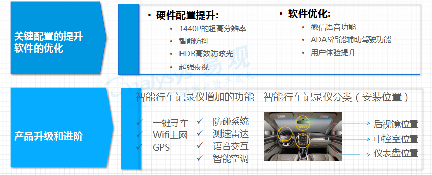 报告分析指出,行车记录仪产品技术发展呈现层次化,阶梯化和分散化特点,智能行车记录仪功能的增加和分类的细化是产品升级和进阶的通用途径。如今,国民消费水平不断提高,消费升级势必拉动产品升级,行车记录仪产品自然也不能例外,需要有更为多样化的机型和全面智能化的功能,以满足消费者需求。
